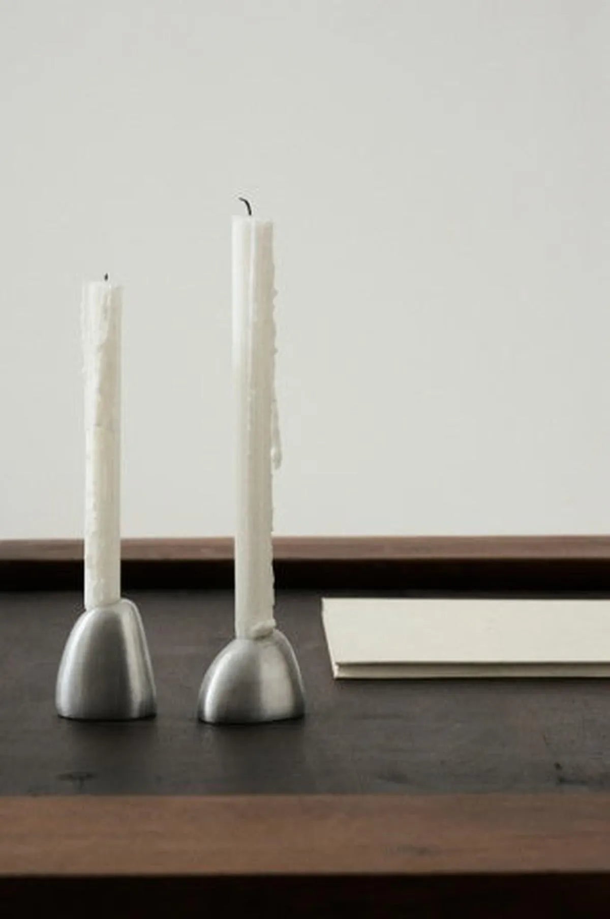De 'Out of Lines' serviescollectie bevat ook twee organische kaarsenhouders van matgepolijst aluminium en een glazen kaarsenhouder, die perfect aansluiten bij de keivormen van het servies.