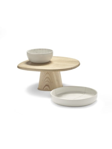 De houten Dune accessoires benadrukken de unieke eigenschappen die inherent zijn aan essenhout. De taartstaanders en dienbladen zijn organisch van vorm, speels van aard en functioneel in gebruik. Een taartstaander is voorzien van een fraaie glazen stolp.