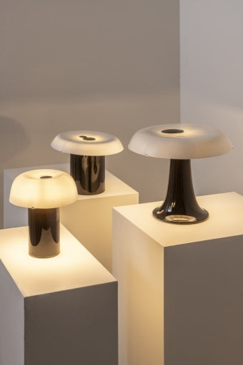 Céline is een reeks van drie bijzondere tafellampen met een zwarte basis in steengoed en een lampenkap in bone china, een materiaal dat zich uitstekend leent om een dunne, elegant-ogende vorm te creëren. Deze lampen spelen met het klassieke zwart-witcontrast, versterkt door Le Grelle's toevoeging van een zwarte stip bovenaan de witte porseleinen kap. Bij verlichting ontstaat een intrigerend schaduwspel. Céline komt in drie versies en is voorzien van een stoffen snoer met schakelaar.