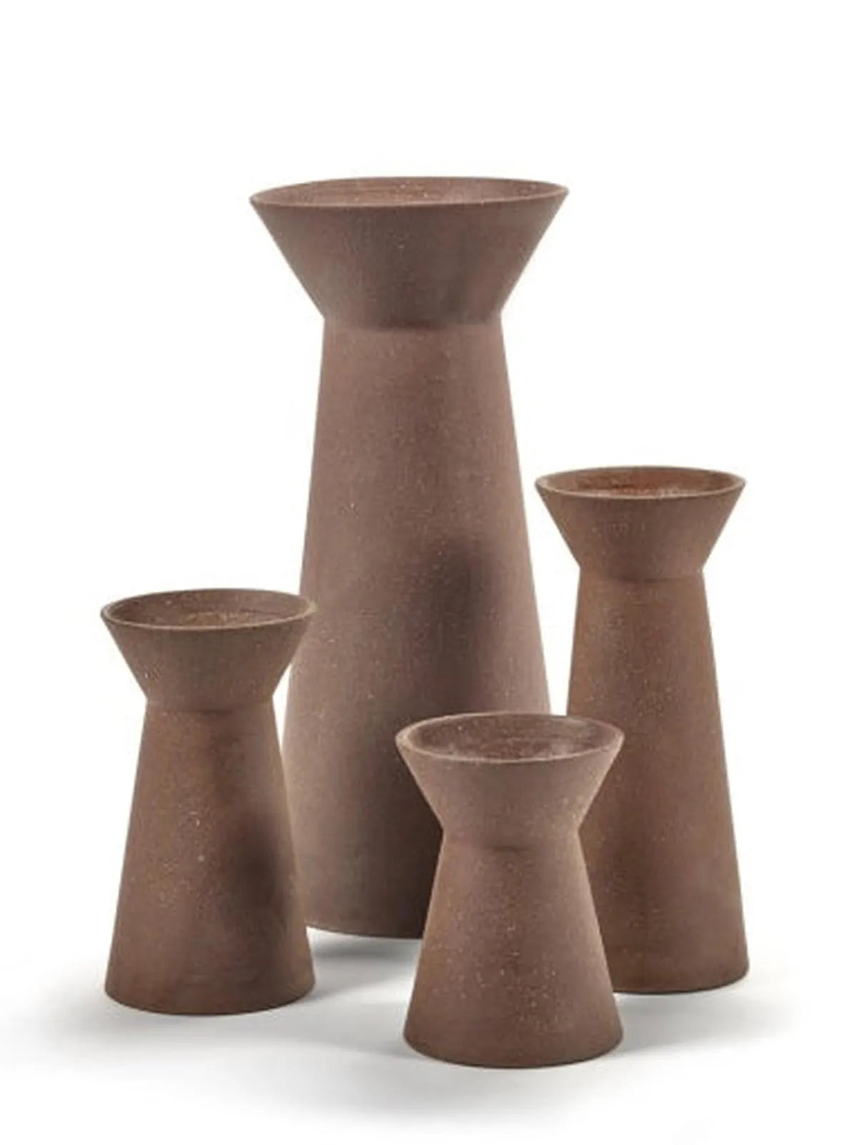 Marie-Ann is de naam van een collectie vazen en twee kandelaars in rode klei met extra chamotte voor een authentieke, matte textuur. De buitenkant blijft ongeglazuurd, terwijl de binnenkant waterdicht gemaakt is met een siliconen coating. De bewust archetypische, eerder geometrische vormen maken ze veelzijdig en geschikt voor diverse interieurs.