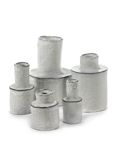 De vijf vaasjes in donkerbruin, bijna zwart steengoed zijn de eerste stapjes van Marie Michielssen als keramiste. Wie haar werk volgt weet dat Marie graag met haar handen werkt. Eerder zei ze hierover dat modelleren met gips en papier-mâché haast een vorm van meditatie voor haar was, door het repetitieve van de handelingen. De stap zetten naar keramiek was dus niet zo groot. De eenvoudige cilinders zijn onregelmatig van vorm, het kenmerk van handwerk. Door het unieke karakter zijn ze decoratief met of zonder bloem.
